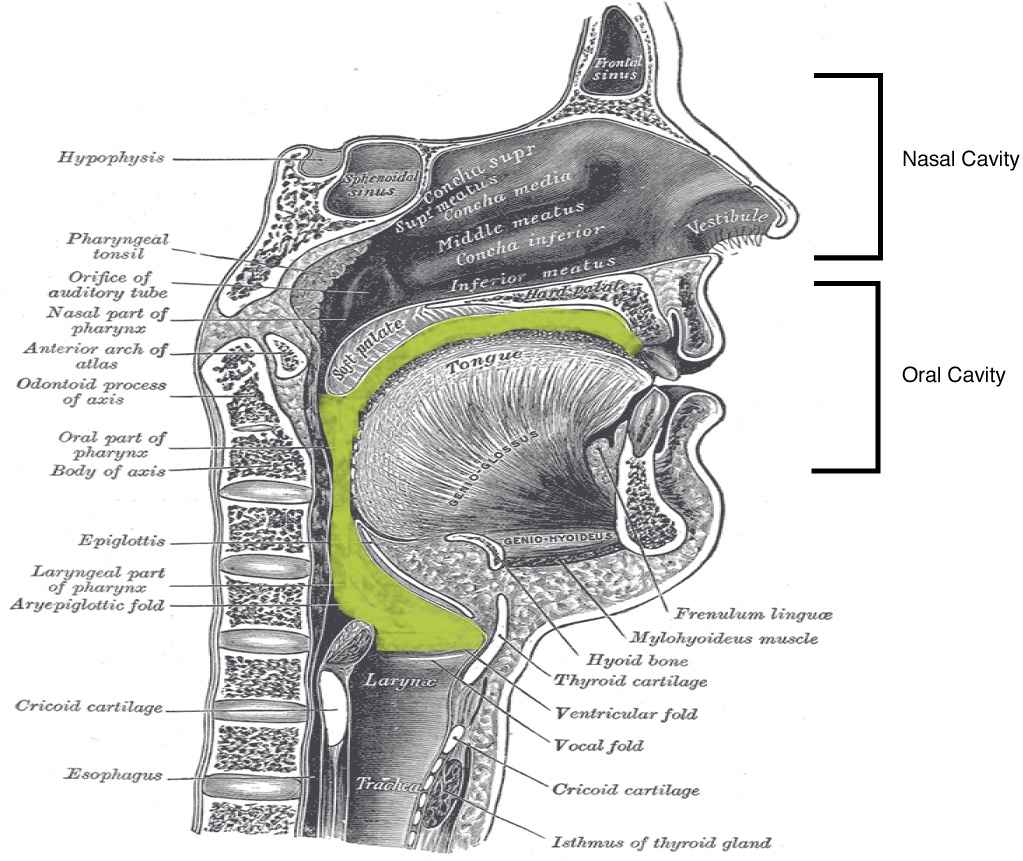 Your vocal tract goes from your lips all the way down to your vocal folds (highlighted in green in the diagram above). This is a flexible tube that can change shapes to make different sounds.