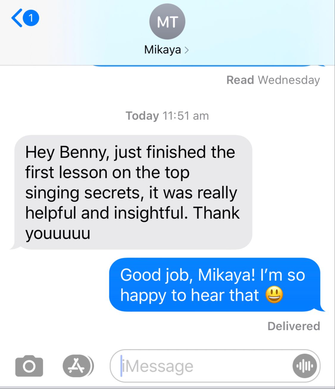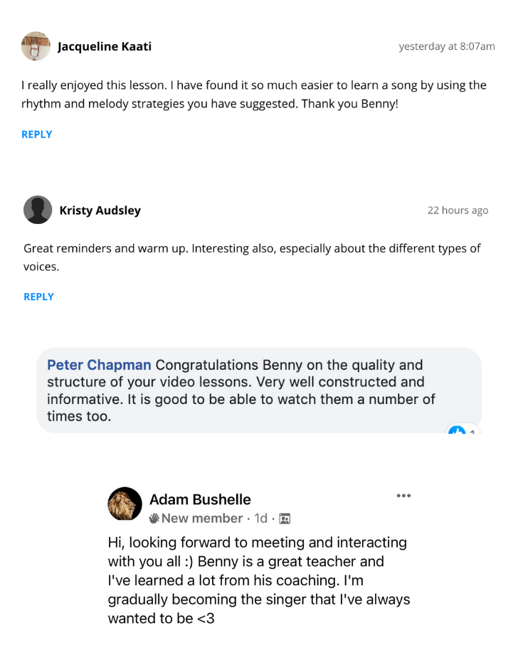 "I never used to sing in front of people… only by myself in the shower or in my bedroom. Being a part of this course has been a big help… me gaining confidence in my voice and improve my abilities to sing better and also learn the fundamentals and basics of singing. It does a really good job of explaining the techniques, how to find your range and activities for you to do throughout the week to implement your learning. One of the things that I love about it is that you can go at your own pace…"